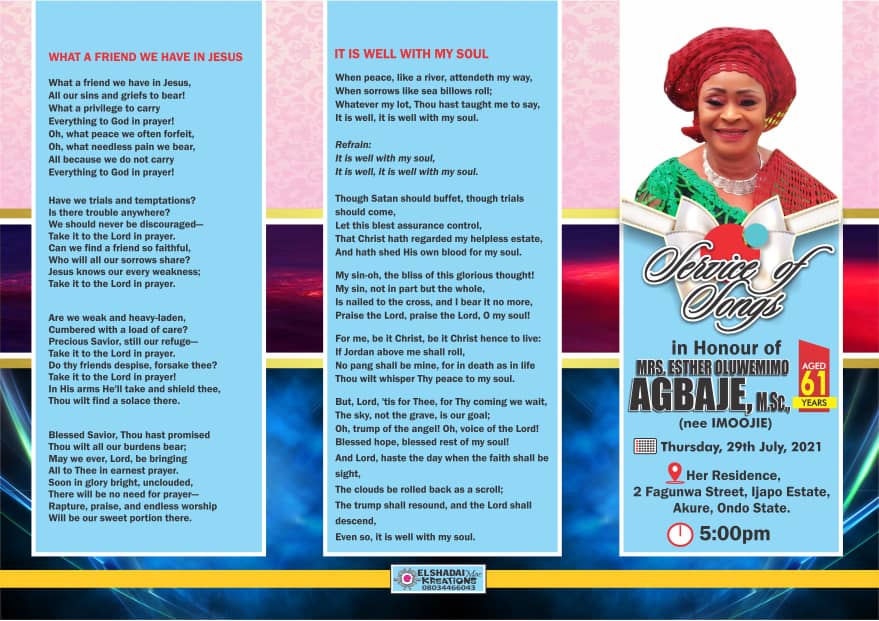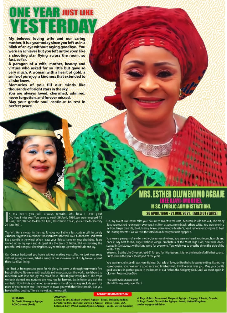 My wife, Mrs. Esther Oluwemimo Agbaje's One-Year Death Anniversary came up on Tuesday 21st June, 2021.